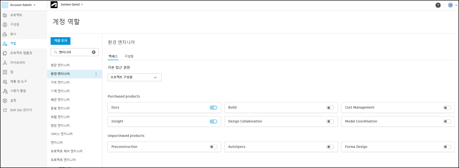 역할은 제품 액세스를 제어합니다. 멤버를 초대하기 전에 역할을 설정하면 모든 멤버가 새 프로젝트에 액세스할 때 필요한 제품 및 도구에 액세스할 수 있습니다. 여러 역할을 가진 사람은 결합된 역할에 액세스할 수 있습니다. 예를 들어, 프로젝트 관리자와 제출 자료 관리자 역할이 있는 사람은 두 역할에 모두 액세스할 수 있습니다.