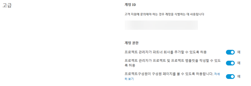 계정 관리자는 프로젝트 관리자의 일부 기능을 제어할 수 있습니다. 다음 기능을 켜거나 끌 수 있습니다.