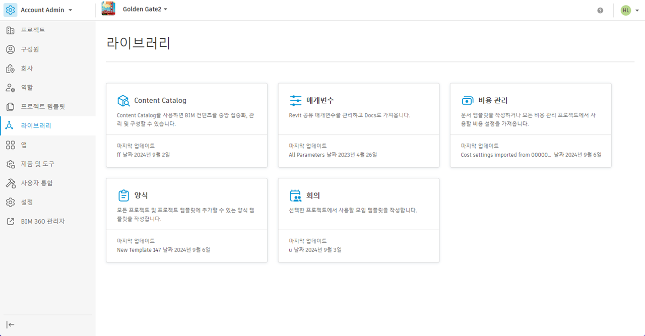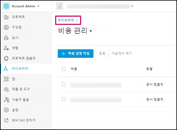 Account Admin의 라이브러리 도구는 계정의 프로젝트 및 프로젝트 템플릿에서 사용할 수 있는 중앙 집중식 객체 컬렉션입니다.