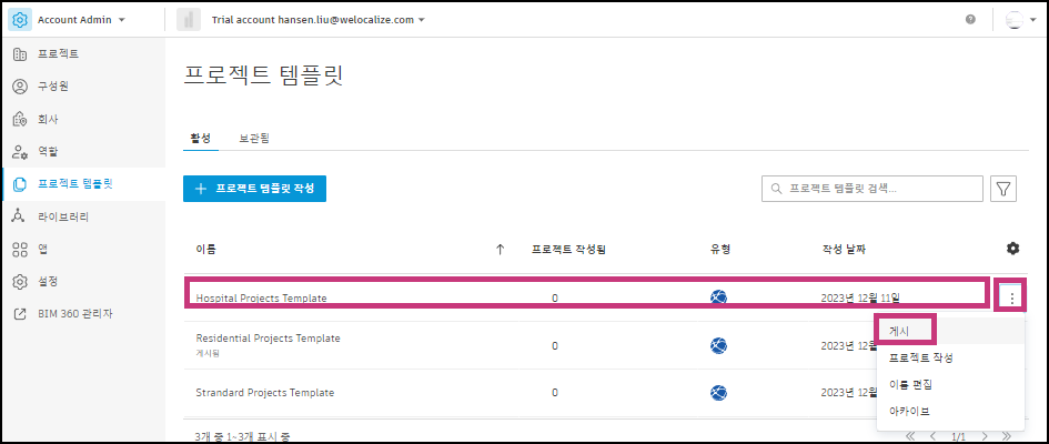 해당 프로젝트 템플릿 행에서 줄임표를 클릭하고 게시를 선택합니다.