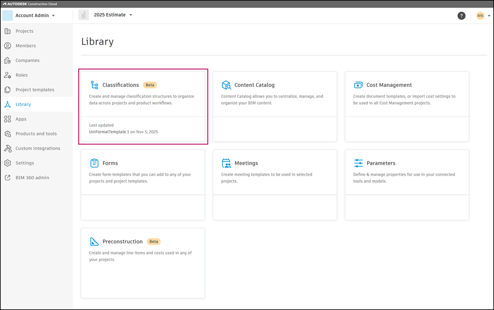 계정 관리자는 계정 관리 내의 라이브러리에 있는 분류 카드에서 계정에 대한 라이브러리 분류를 작성하고 관리할 수 있습니다.