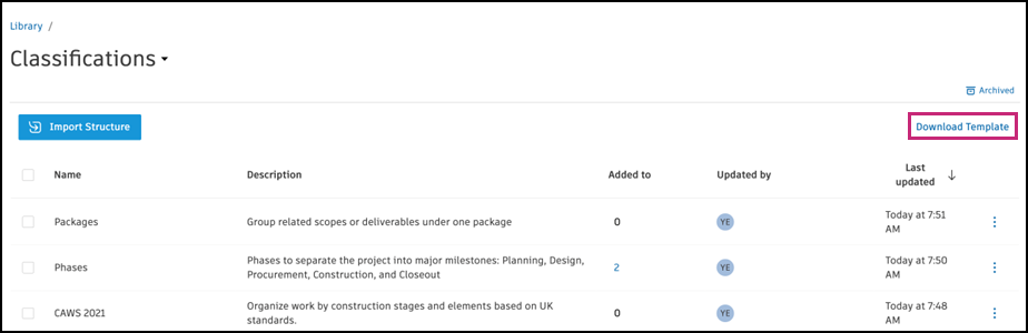 - 템플릿 다운로드를 클릭하여 XLSX 템플릿 다운로드하고 이를 사용하여 분류 구조를 작성합니다.