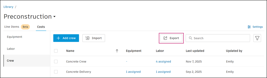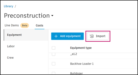 계정 관리자는 프리컨스트럭션 비용 라이브러리에 한 번에 하나씩 비용을 입력하거나, 여러 비용이 포함된 XLSX를 라이브러리로 가져와 Account Administration의 계정 라이브러리에서 비용을 설정할 수 있습니다. 라이브러리에서 XLSX로 라이브러리 비용을 내보낼 수도 있습니다.