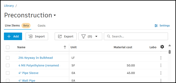 가져오기에 계정 라이브러리의 비용을 포함하려면 먼저 계정 라이브러리에 인건비, 장비 및 인건비를 추가해야 합니다. 이러한 비용을 사용할 수 있는 경우 해당 비용을 선택할 수 있으며 해당 데이터는 품목 가져오기 XLSX에 채우기됩니다. 프리컨스트럭션 라이브러리에 비용 추가에 대해 알아보십시오.