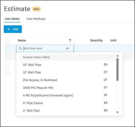 견적에서 품목을 추가할 때 견적 테이블 행에서 이름 필드를 클릭하고 항목 이름을 입력하여 라이브러리 품목 항목을 검색합니다.