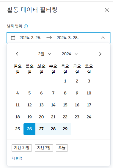 클릭하여 이전 기간으로 이동합니다. 예를 들어, 선택한 날짜 범위가 2024년 3월 18일 → 3년 2월 25일이면 이전 를 누르면 이 범위가 2024년 3월 10일 → 3년 17월 4일로 변경됩니다.필터 고려 사항