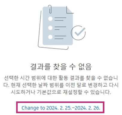 결과를 찾을 수 없는 경우 페이지 중간에 결과를 찾을 수 없음 메시지가 표시됩니다. 메시지 아래의 링크를 클릭하여 현재 선택한 날짜 범위를 변경하고 다시 시도할 수 있습니다.