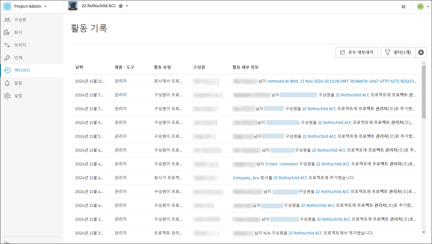활동 로그는 관리자, 문서, 이슈 및 스프레드시트 활동이 지속된 기간에 관계없이 해당 활동의 시간순 기록을 제공합니다. 이 도구는 프로젝트 관리자에게 누가 어떤 활동을 언제 수행했는지에 대한 자세한 개요를 제공합니다. 추적된 이벤트의 전체 리스트는 활동 로그에서 추적된 활동을 참조하십시오.