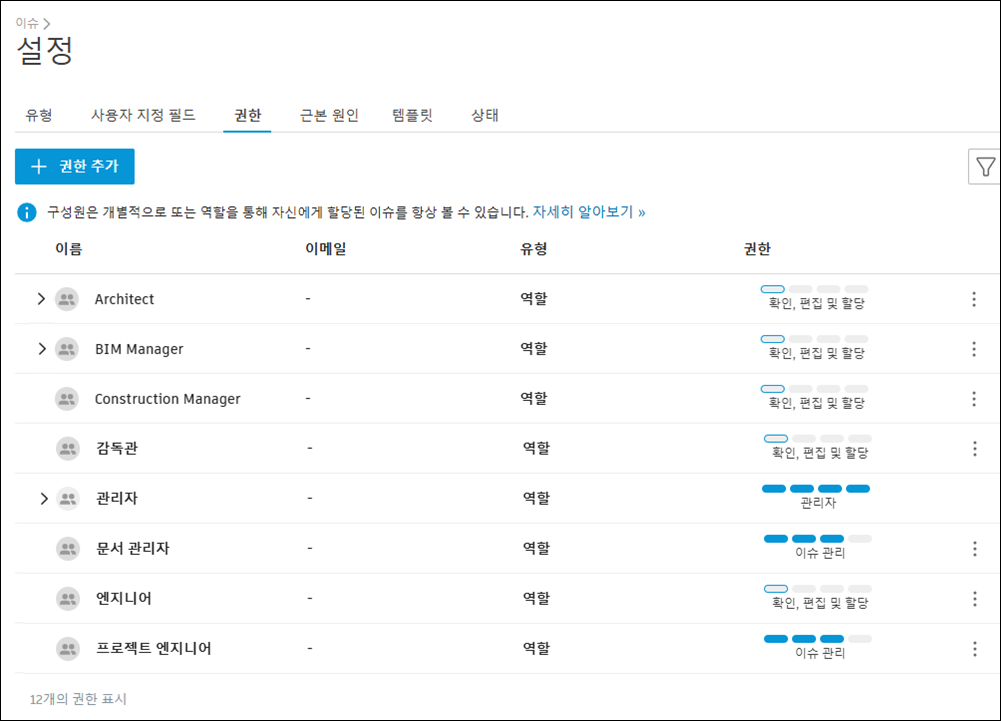 | 권한 | 프로젝트 역할에 대한 권한 구성 | 이슈 권한 |