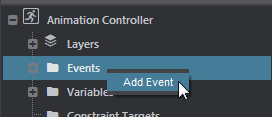 왼쪽 패널에서 Events를 마우스 오른쪽 버튼으로 클릭하고 Add New AnimEvent를 선택합니다.