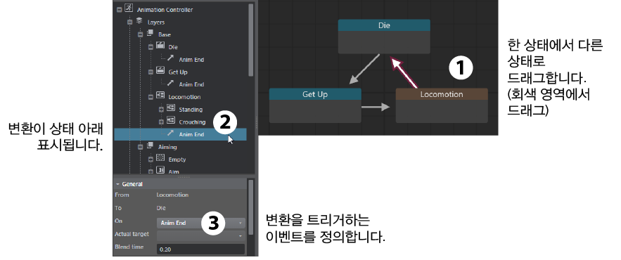 노드 그래프 영역에서 한 상태에서 다음 상태로 드래그합니다(노드의 회색 부분 드래그).