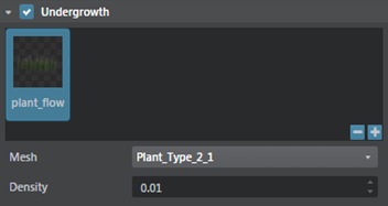 덤불 오브젝트는 카메라 거리에 따라 표시되는데, 카메라가 레이어에 가까이 가면 채워지고 카메라가 멀어지면 오브젝트가 제거됩니다. Density 특성을 사용하면 덤불 설정에서 오브젝트의 밀도를 조정할 수 있습니다.