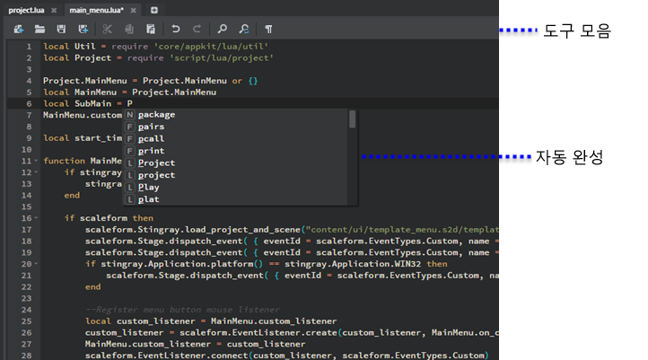 Script Editor는 Lua 문서화 및 Lua 명령 자동 완성 기능을 둘 다 통합해 입력 시 동적 툴팁에 참조 정보와 자동 완성 제안 사항이 표시됩니다.