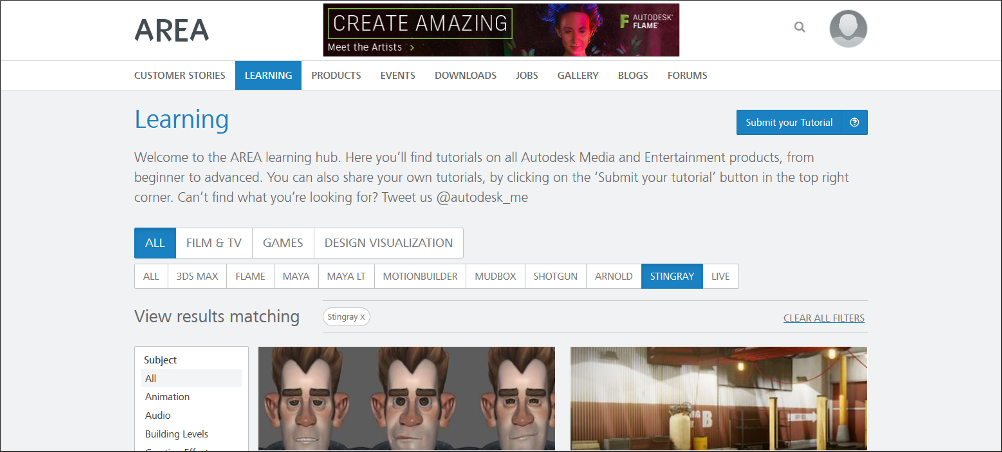 Autodesk ID로 AREA에 로그인하고 LEARNING 허브에서 오른쪽 상단에 있는 큰 파란색의 Submit your Tutorial 버튼을 찾습니다.