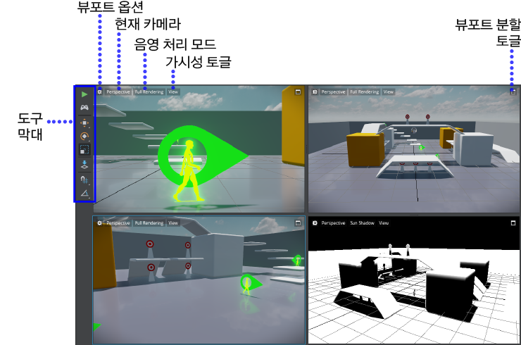 참고: Level Viewport View 메뉴는 각 뷰포트 패널에 대한 개별적인 표시 및 숨기기 옵션을 제공합니다. 모든 뷰포트에서 기즈모 또는 그리드를 전역적으로 표시하거나 숨기려면 Edit 메뉴의 표시/숨기기 컨트롤을 사용합니다.