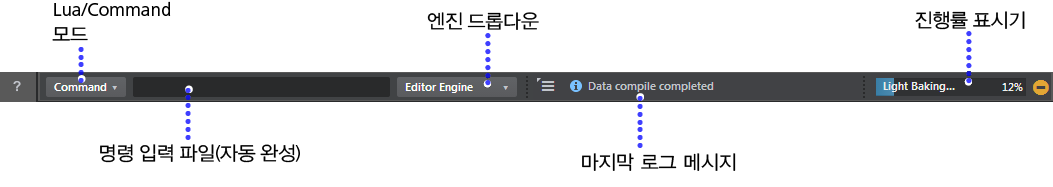 상태 막대의 오른쪽은 라이트 적용, 데이터 컴파일 및 수준 로드와 같은 진행 중인 작업의 상태에 대한 피드백을 제공하는 진행률 표시기를 위한 자리로 예약되어 있습니다.