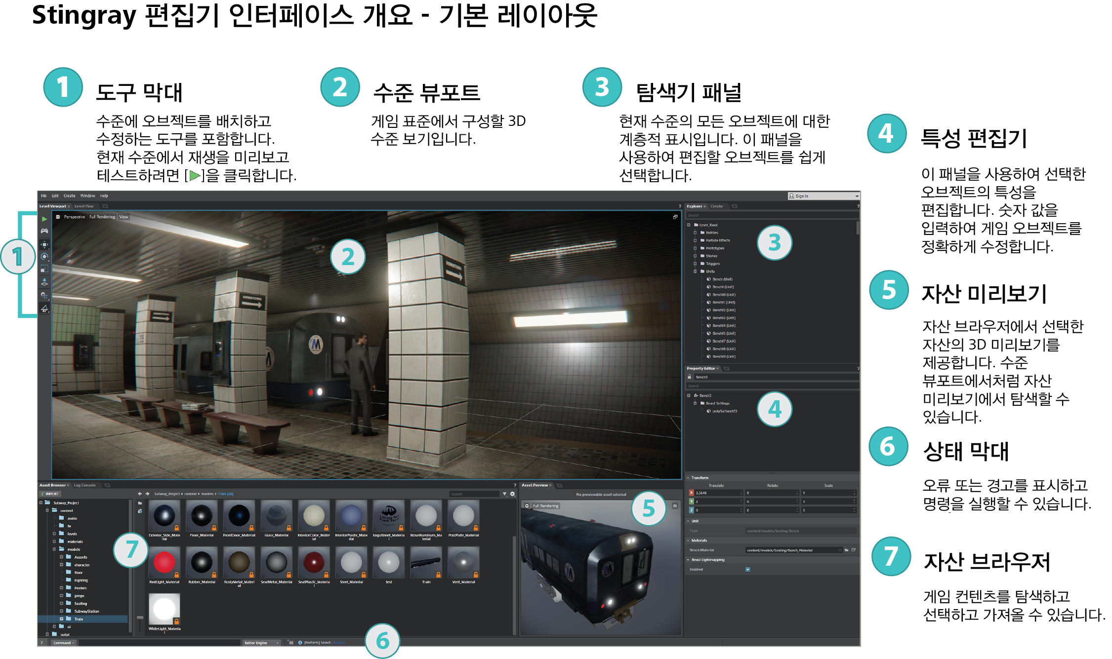 팁: Stingray 편집기에서 창을 드래그하고, 드롭하고, 다시 정렬할 때 Window > Layout > Reset Layout을 선택하여 언제든지 인터페이스를 이 구성으로 복원할 수 있습니다.
