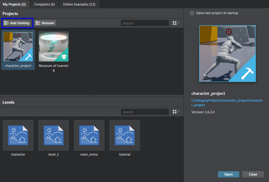 Add Existing을 클릭해 로컬 컴퓨터에서 프로젝트의 위치를 찾습니다. 프로젝트의 .stingray_project 파일을 선택하고 Open을 클릭합니다.