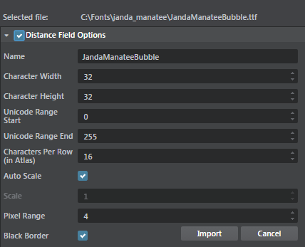 창이 나타나면 Distance Field Options를 활성화하고 필요한 경우 글꼴 설정을 변경하고 Import를 클릭합니다.