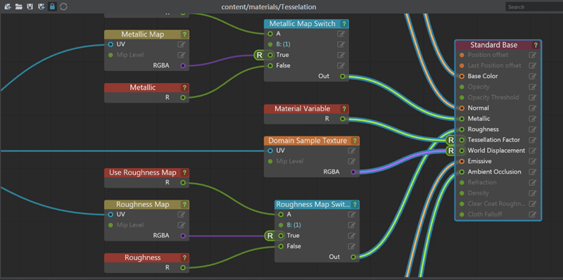 팁: 테셀레이션 입력을 구동하려면 Sample Texture 샘플러 노드 대신 Domain Sample Texture 샘플러 노드를 사용해야 합니다. 이러한 노드에 대한 자세한 내용은 Stingray 셰이더 노드 참조의 Sampling 범주를 참조하십시오.