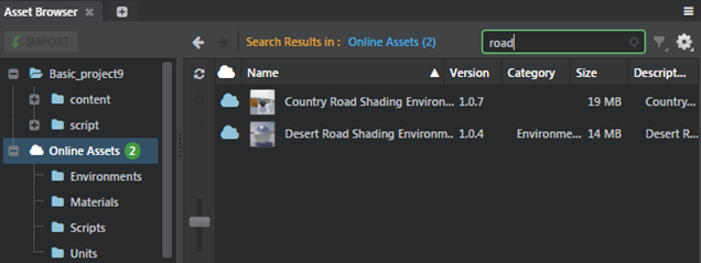 온라인 자산을 검색하면 Asset Browser의 트리 뷰에서 Online Assets 옆에 결과의 수가 표시됩니다. Search 필드에서 Clear 아이콘을 클릭하여 Search 결과를 지울 수 있습니다.