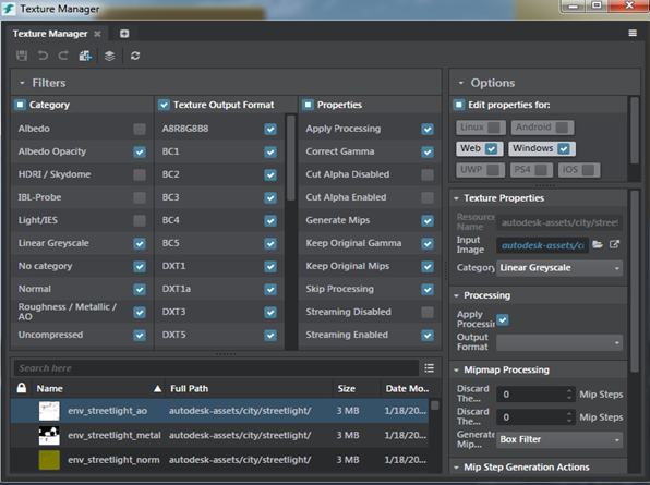 이전 릴리스에서 지속적으로 개선되어 Texture Manager 도구의 모양이 더욱 개선되었습니다. 플랫폼 목록이 선명하고 간결해 보이며, 텍스처 뷰 목록에 추가된 헤더를 통해 체계적으로 텍스처를 볼 수 있습니다. 크기, 수정한 날짜 또는 이름으로 정렬하여 Texture Manager에서 텍스처를 구성할 수 있습니다. 또한 활성화된 필터나 크기 조절된 필터 뷰처럼 사용자가 조정하는 UI 레이아웃의 상태가 이제 Texture Manager에서 그대로 유지됩니다.