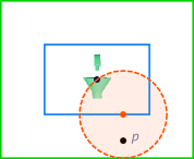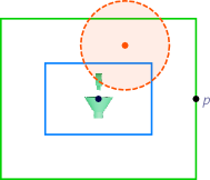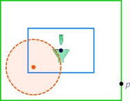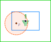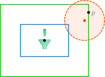 예를 들어, 플레이어(p)가 오른쪽으로부터 외부 체적에 들어가는 경우 이벤트가 내부 체적의 빨간색 지점에서부터 재생됩니다. 점선은 사운드 감쇠 범위의 한도를 보여줍니다. 플레이어가 다른 곳으로 이동하면 사운드가 내부 체적에서 가장 가까운 지점으로 이동하면서 플레이어의 위치를 추적합니다. 플레이어가 내부 체적으로 들어가면 사운드가 플레이어의 위치를 따라갑니다.