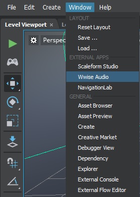 Window > Wwise Audio를 선택하여 작성 도구를 엽니다. 이렇게 하면 연관된 Stingray 프로젝트에 대한 오디오 프로젝트에 액세스할 수 있습니다.