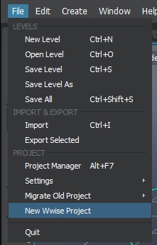 프로젝트를 템플릿으로 생성하지 않은 경우 새로운 Stingray 프로젝트와 함께 새로운 Wwise 프로젝트를 생성해야 합니다. 이렇게 하려면 File > New Wwise Project를 선택합니다.