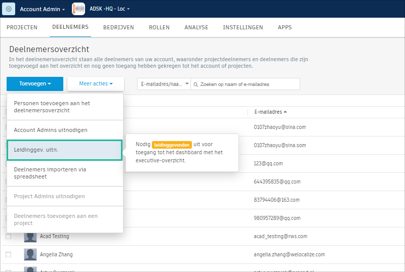 Leidinggevenden zijn deelnemers met toegang tot het Exec-overzicht om analyses in meerdere projecten te bekijken in het dashboard Exec-overzicht in de Insight-module. Dit vereist een abonnement waarbij Insight is inbegrepen.