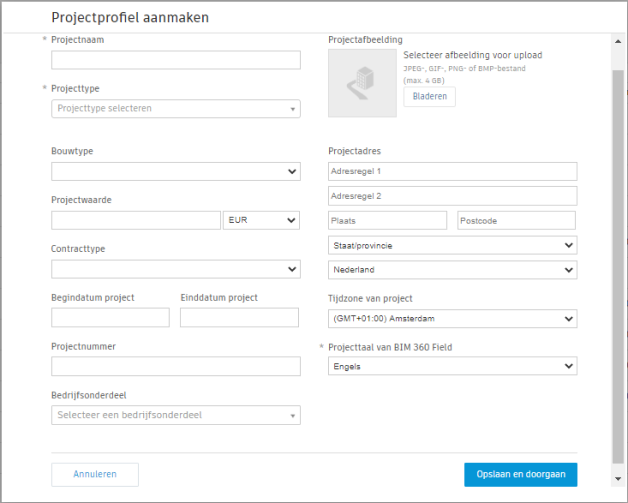 In het dialoogvenster Projectprofiel aanmaken geeft u de projectnaam op en voert u de projectgegevens in. De vereiste velden zijn gemarkeerd met een sterretje. Sommige velden, bijvoorbeeld de start- en vervaldatum, worden gebruikt voor bedrijfsrapportage en -analyse om ervoor te zorgen dat alle teamdeelnemers in verschillende workflows consistente projectinformatie hebben.