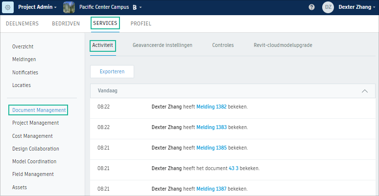 Wanneer er wijzigingen worden aangebracht in projecten met de Document Management-module, worden deze wijzigingen opgenomen in de activiteitenlog. U kunt voor een geselecteerd datumbereik de activiteit bekijken en de log exporteren als een Excel-spreadsheet.