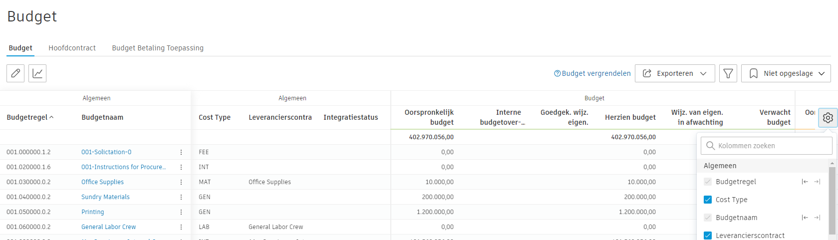 Voor de gedetailleerde weergave van de SOV van het contract kan de kolommodus ook de oorspronkelijke kolommen met betrekking tot budget weergeven als Eén budget voor meerdere contracten niet is geselecteerd.