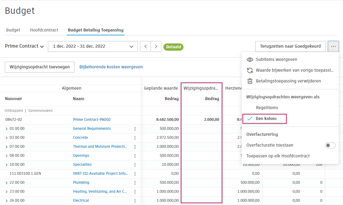 Voor Hoofdcontract en Budgetbetalingstoepassing toont de kolommodus goedgekeurde OCO's.