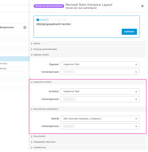 In de sectie van de vervolgwerkbalk met de titel 'Gegevens architect' kunnen deelnemers de bedrijfsgebruiker van de externe architect selecteren om COR/OCO-goedkeuring aan te vragen.