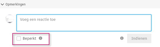 Deelnemers met de machtigingen voor volledige controle of beheer zien een selectievakje onder het opmerkingenvak. Als dit selectievakje is aangevinkt, wordt de opmerking gemarkeerd als Beperkt.