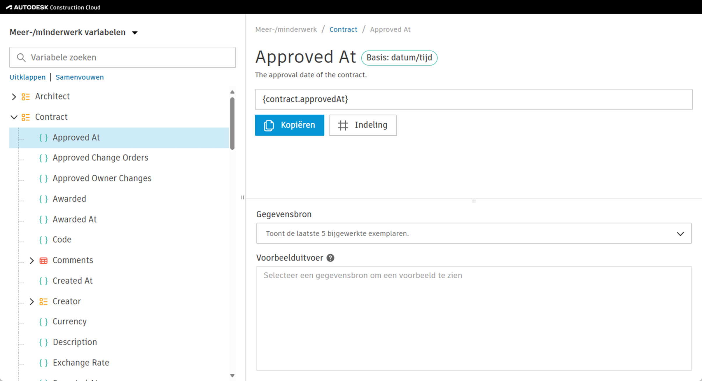 Documentsjablonen maken gebruik van variabelen om gegevens op te halen uit 'Cost Management'. Projectbeheerders die de documentsjablonen definiëren, kunnen dezelfde variabelen gebruiken om automatisch gegevens binnen te halen als het document wordt gegenereerd. Hiermee voorkomt u het handmatig invoeren van gegevens in formulieren en velden in documenten.
