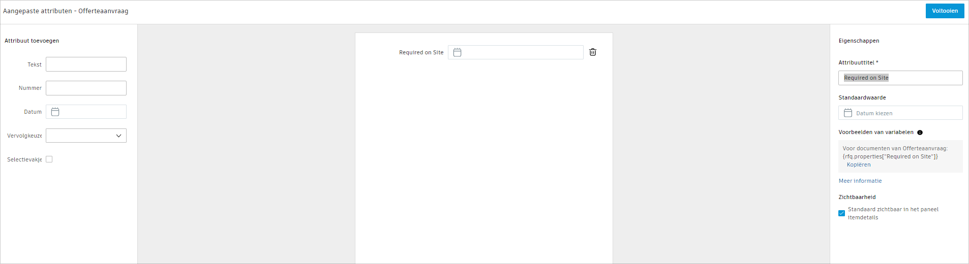 Een aangepast attribuut datum voor een RFQ genaamd 'Vereist ter plaatse' is bijvoorbeeld {rfq.properties["Required on Site"]} en geeft de opgegeven datum.