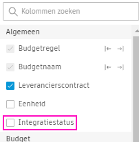 Door de kolom ‘Integratiestatus’ aan de tabbladen ‘Budget’, ‘Kosten’ en ‘Wijzigingsorder’ toe te voegen, kunt u zien welke van de items, secties, en acties worden vergrendeld en geïntegreerd.