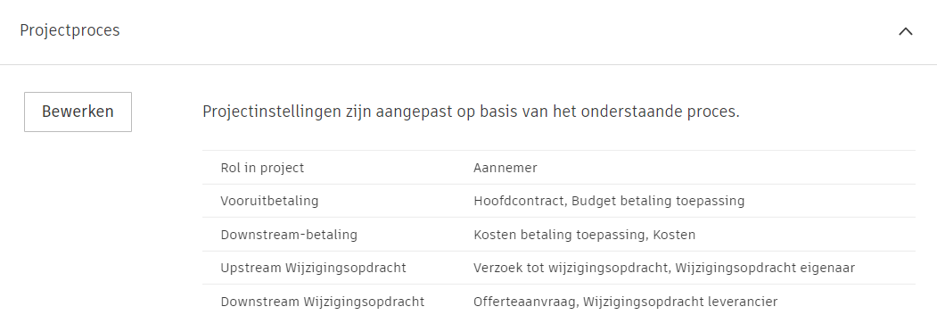 Raadpleeg het gedeelte Projectproces in het artikel ‘Algemene instellingen voor Cost Management’ voor meer informatie.
