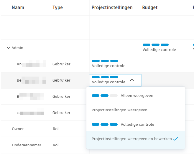 | Geen toegang | - | Gebruik dit voor leveranciers of derden die met uw bedrijf samenwerken, maar geen toegang mogen hebben tot de financiële informatie van het project. | Gebruik dit voor leveranciers of derden die met uw bedrijf samenwerken, maar geen toegang mogen hebben tot alle financiële informatie van het project. | |