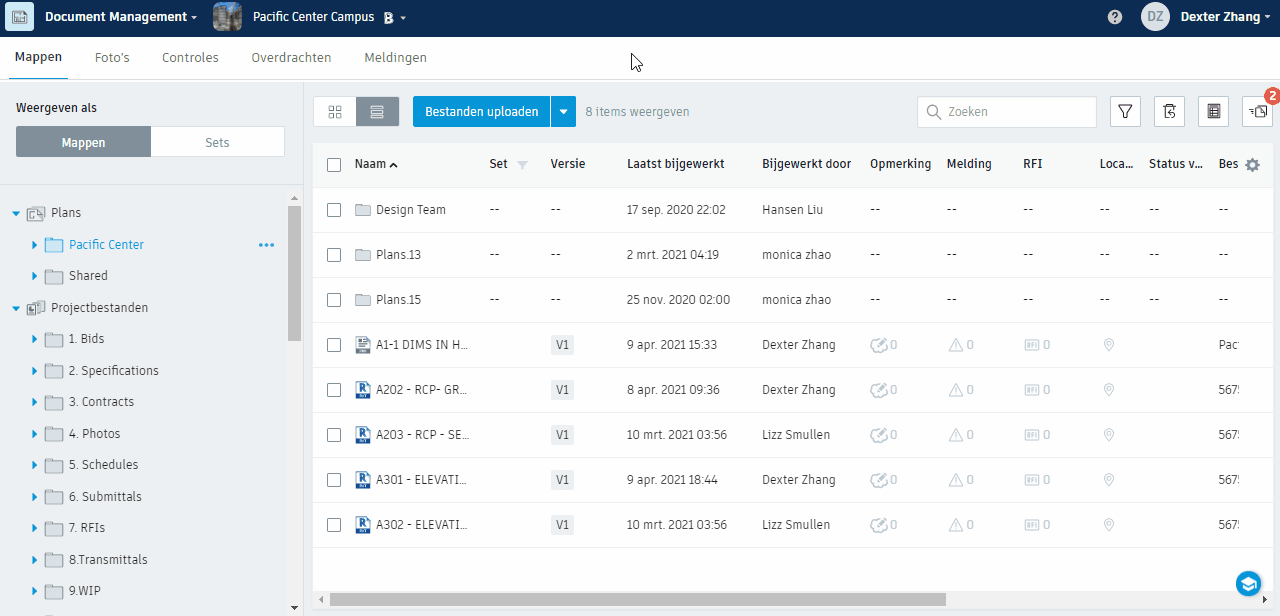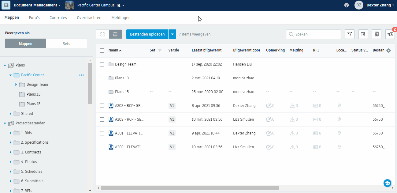 Klik in het tabblad Mappen op Bestanden uploaden om een document naar de geselecteerde map te uploaden.