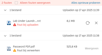 Als u bestanden uploadt naar Projectbestanden, doorlopen de bestanden een proces in twee fasen om te controleren of ze geüpload en bekeken kunnen worden zodra ze zijn geüpload. Bestanden kunnen de volgende fouten weergeven: