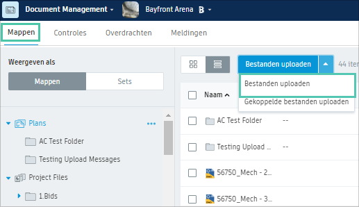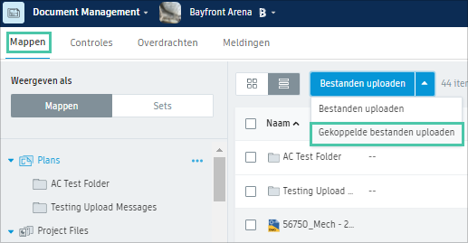 Gebruik deze methode voor niet-gekoppelde pdf's, tekeningen, ontwerpen en andere ondersteunde bestanden. De workflow voor het uploaden van pdf's verschilt van andere bestanden, aangezien u tijdens het uploaden een onderhoek (lay-outsjabloon) kunt opgeven. Als u een aantal afzonderlijke pdf's tegelijk uploadt, kunt u hetzelfde onderhoek aan alle documenten toewijzen.