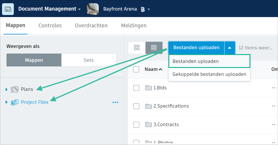 De mappen Bouwtekeningen en Projectbestanden gebruiken voor het uploaden en ordenen van uw documenten en modellen. Kom meer te weten over de verschillen tussen de maptypen.
