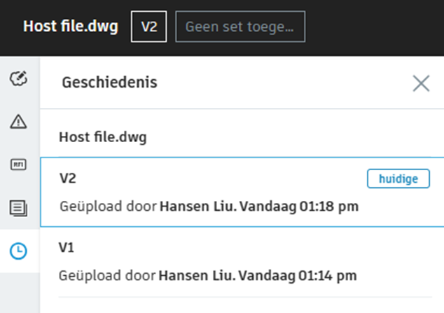 Wanneer een deelnemer een DWG-hostbestand opent via de module Document Management in BIM 360, ziet deze aanvankelijk alleen de xref-inhoud in de viewer die was opgeslagen op het moment dat het hostbestand werd geüpload. Wanneer xref's worden bewerkt en opgeslagen (bijvoorbeeld door deze bewerkte xref's via Desktop Connector op BIM 360 te zetten), worden er nieuwe versies van de xref-bestanden gemaakt die niet automatisch worden bijgewerkt naar het DWG-hostbestand. Dit is het gevolg van de Document Management-module die gebruikmaakt van versiebeheer om te voorkomen dat een oudere versie van een DWG-hostontwerpbestand zijn referentietekeningen verkeerd bijwerkt naar een nieuwe versie van xref-bestanden.