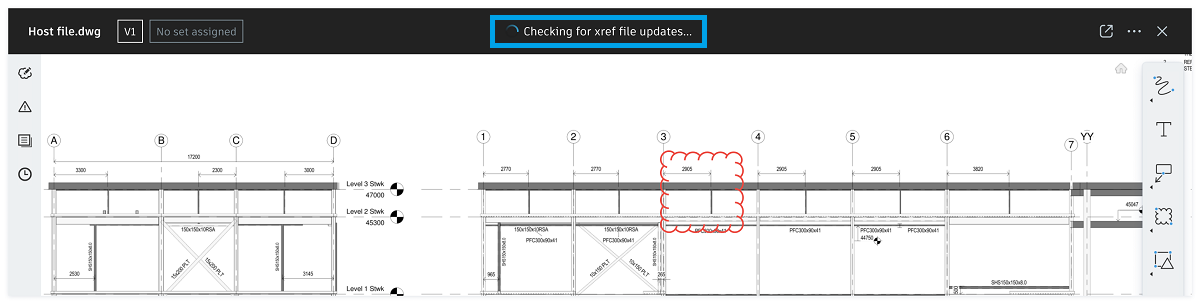 Deelnemers worden in de viewer op de hoogte gesteld wanneer ze een DWG-hostontwerpbestand openen dat verouderde xref's bevat. Deelnemers met de machtiging Bewerken en hoger kunnen het hostbestand in de viewer eenvoudig bijwerken om een nieuwe versie te maken waarin automatisch de nieuwste xref-versies worden weergegeven.
