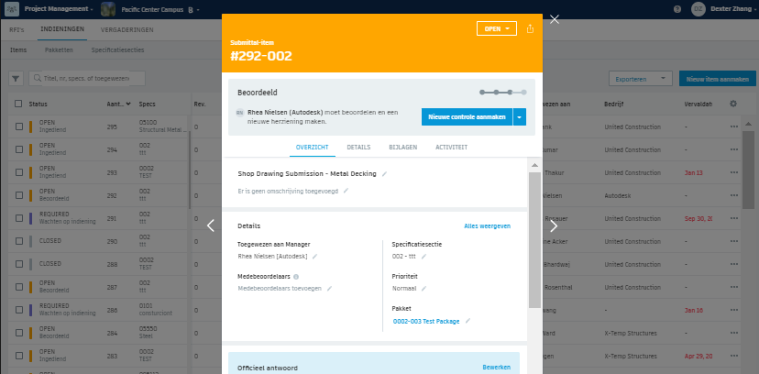 Opmerking: De verantwoordelijke aannemer die aan het submittalitem is toegewezen, moet dezelfde verantwoordelijke aannemer zijn die aan het pakket wordt toegewezen.