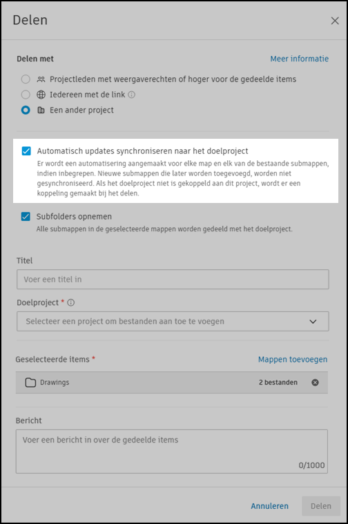 Selecteer het doelproject en de doelmap (indien beschikbaar). Titel en bericht zijn optioneel. Lees meer informatie in de hulpinformatie van ‘Bestanden’ over delen en de projecten die hier worden weergegeven.
