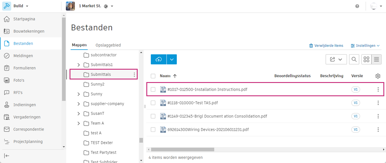 Selecteer een map in het hulpmiddel ‘Bestanden’ om de indiening toe te voegen en klik op indiening opslaan.
